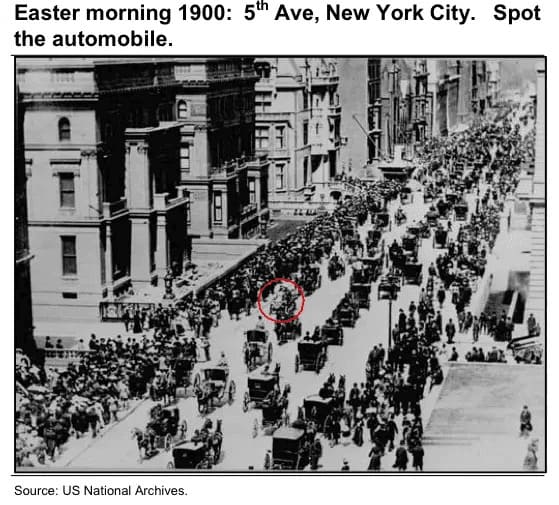 It hit me like a punch to the gut, because I’d just been looking at that famous photo from 1900: Easter Sunday on a busy avenue, one solitary automobile awkwardly navigating among hundreds of horse carriages.
